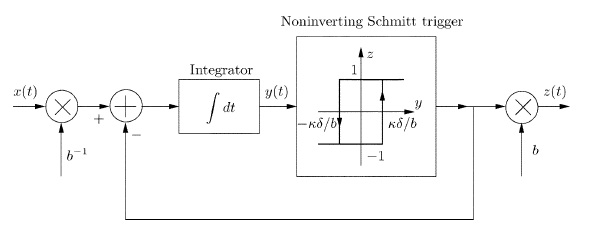 So far so good. But sampling is only half the story in Analog to Digital conversion. Not only should the times be discretized, but the values should also be discretized. In this case we need to use a quantizer on the samples x[n]. Fast, high precision quantizers are expensive, especially at low power. On the other hand, clocks are pretty cheap. The suggestion in this paper is to think about time-encoding mechanisms (TEMs), in which we encode a bandlimited x(t) into a sequence of times {tk}. Another way to think about it is as a signal z(t) taking values +b or -b and switching values at the times {tk}. The disadvantage of this representation is that linear operations on analog signals don’t turn into linear operations on the discrete signals. However, this conversion can be implemented with an adder, integrator, and a noninverting Schmitt trigger that detects when the output of the integrator passes a threshold.
