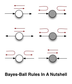 One of the fun thing about graphical models is that arguments can be done by looking at diagrams (kind of like a diagram chase in algebraic topology). One such trick is from R.D. Shachter’s paper in UAI called “Bayes-Ball: The Rational Pastime (for Determining Irrelevance and Requisite Information in Belief Networks and Influence Diagrams)” (see it here. for example). This is a handy method for figuring out conditional independence relations, and is a good short-cut for figuring out when certain conditional mutual information quantities are equal to 0. The diagram below shows the different rules for when the ball can pass through a node or when it bounces off. Gray means that the variable is observed (or is in the conditioning). I tend to forget the rules, so I made this little chart summary to help myself out.