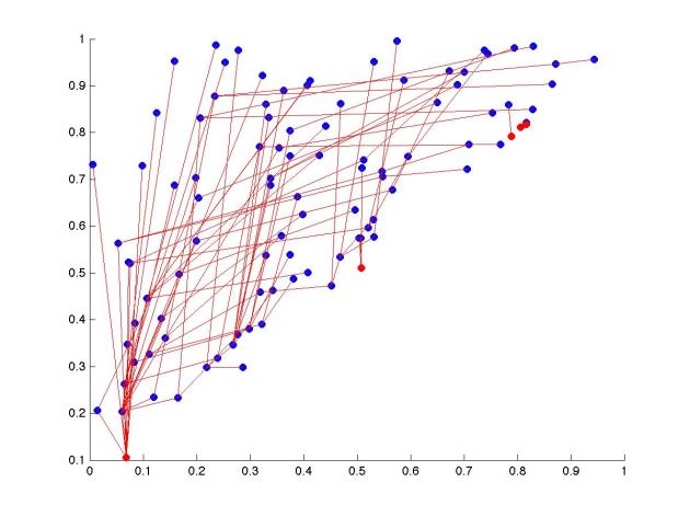 Note that we could have just picked {n} points in this triangle, but it’s more clear to define it step by step. Now let {y_0 = 0} and let {I_j = (y_{j-1},y_j)}. For each {i}, if {x_i \in I_j} for some {j} then draw an edge from {i} to {j}. So what we can do is work our way vertically through the field. Since each point we encounter has a {x_i < y_i} it is in some interval {I_j} for {j \le i}. This is what it looks like as it grows, where a node is red if it got a self-loop from the edge selection process: