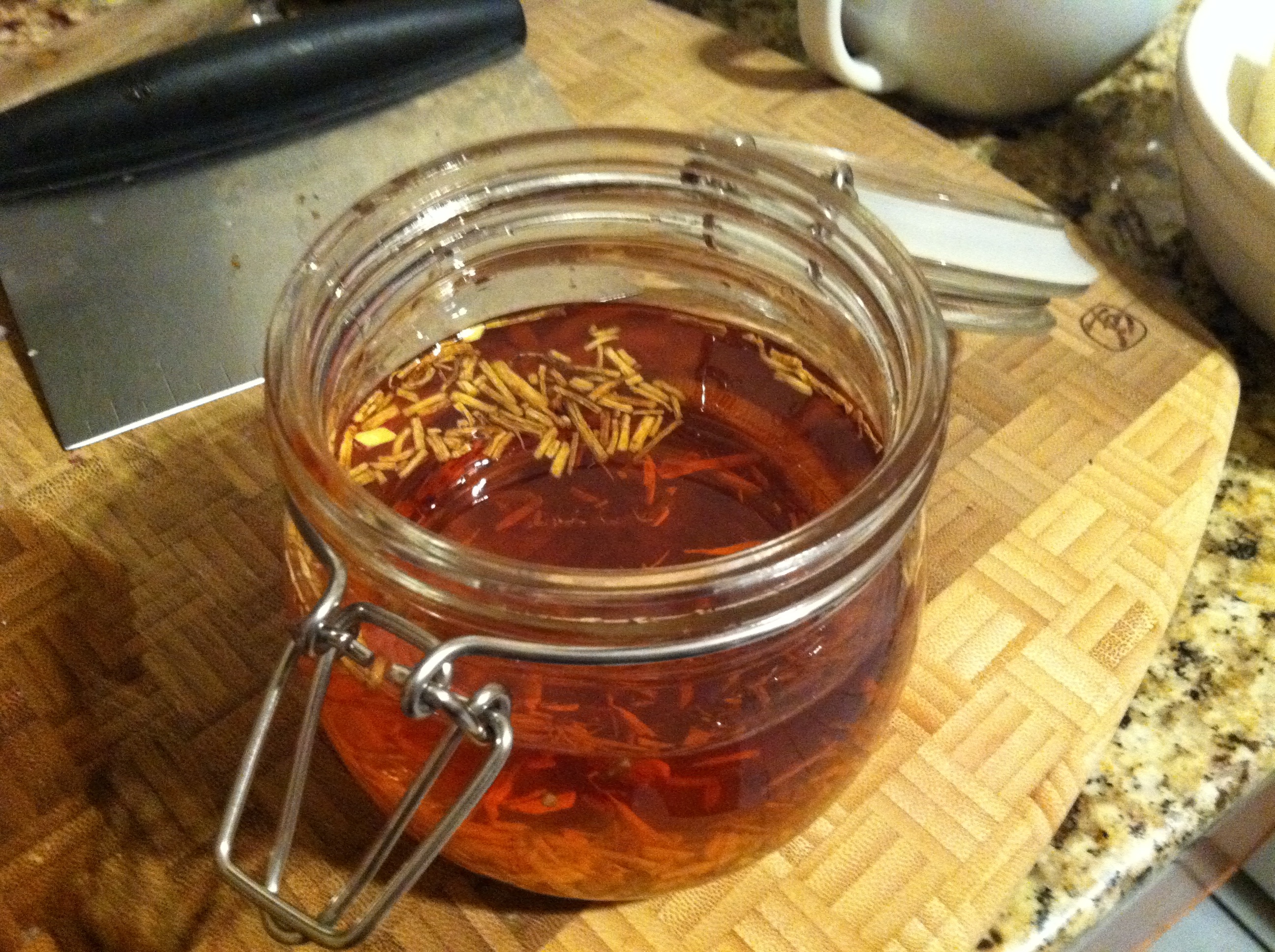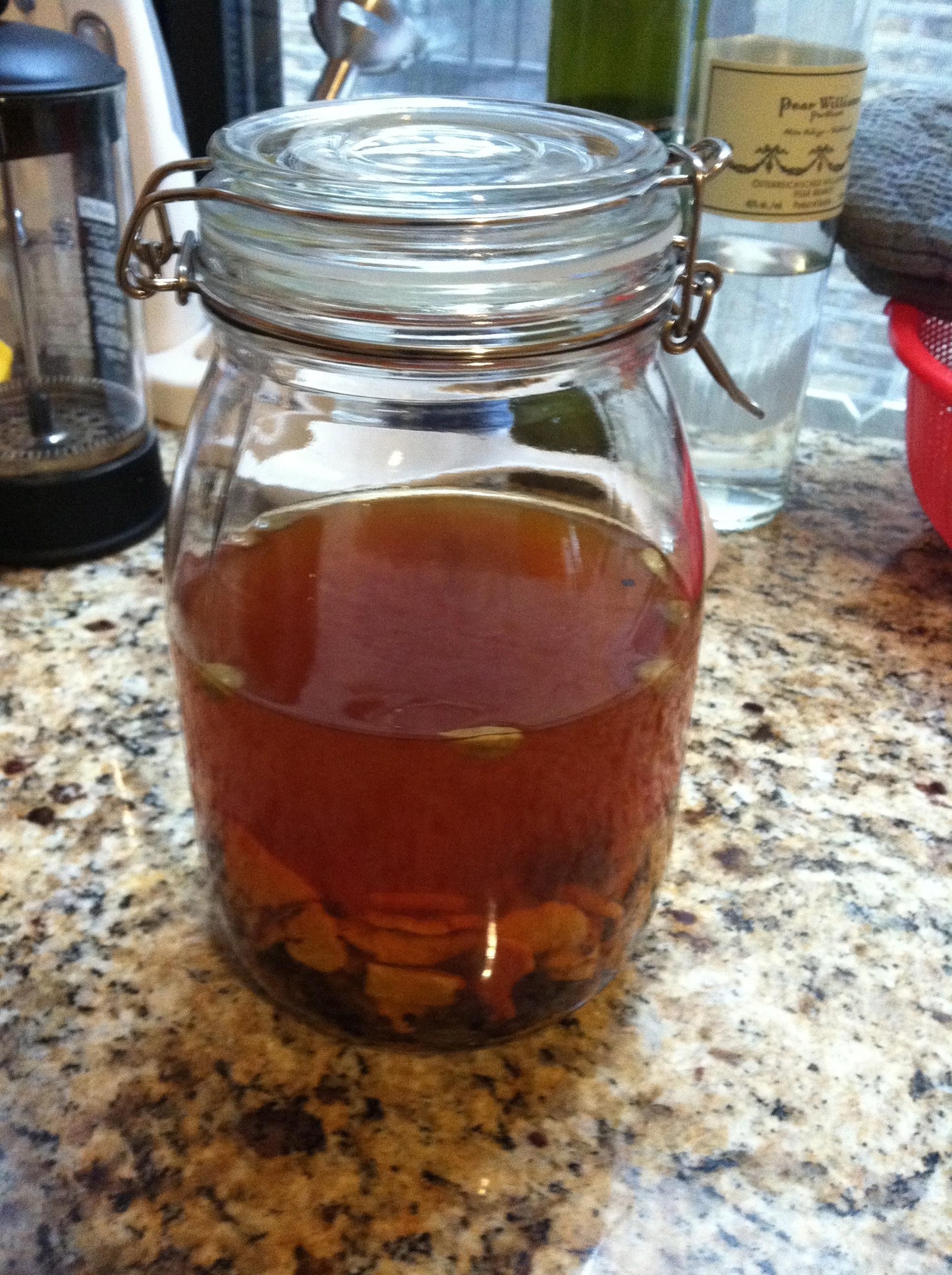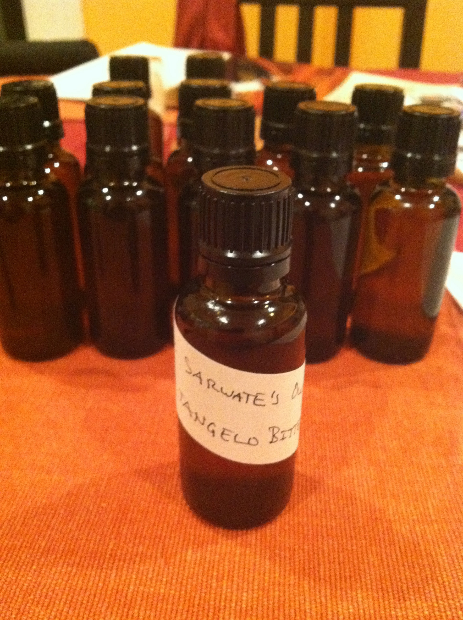 A couple of weeks ago I started a batch of Tangelo bitters, using a couple of recipes I cobbled together from the web as guidelines. To be honest, I can’t even remember which recipes I used, but the closest one is the Serious Eats version. I had not yet obtained the book Bitters, but I figured it would be a fun experiment and I could always foist off the resulting stuff on my friends. The recipe uses two infusions — spices and peel into clear liquor and bittering agents into rye.