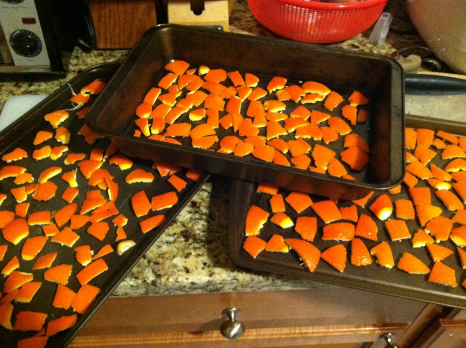 - Peel tangelos and cut up into equal size chunks, maybe 1/2″ square, then bake on low until they dry out.