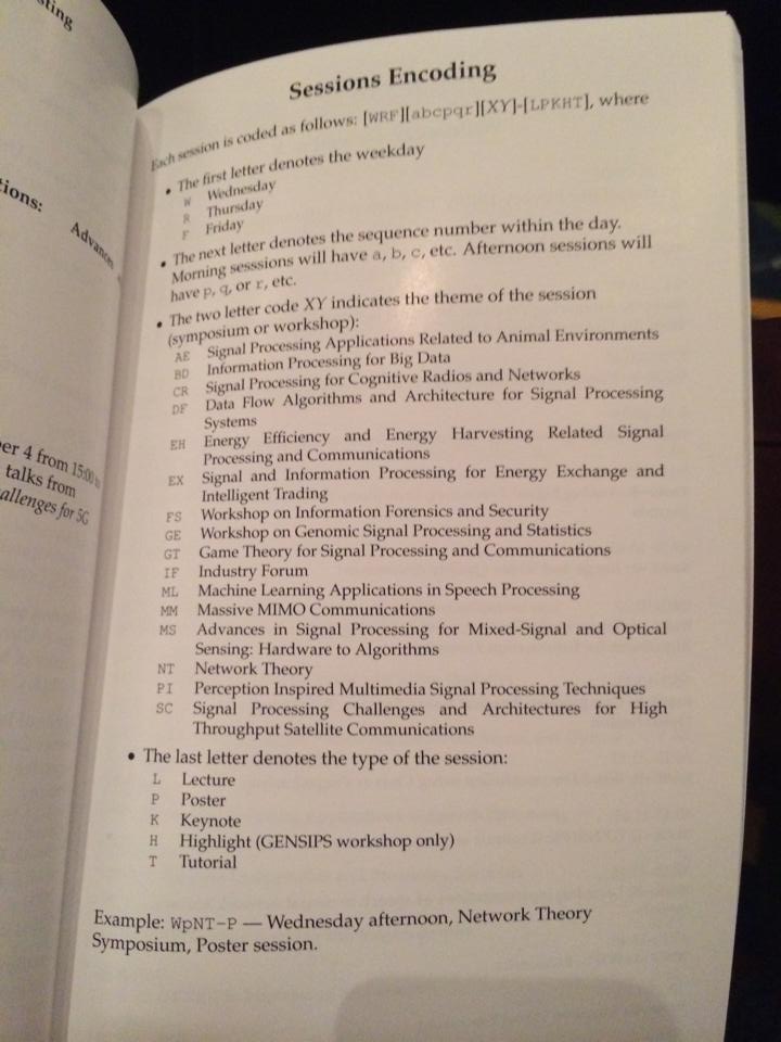 Much like last year, GlobalSIP had a somewhat disjointed, semi-chaotic feel (exacerbated by tiredness, I am sure) — it’s really a collection of semi-interacting workshops in the same space, and I knew people in several of the other workshops. Since I was there for a day and giving a tutorial at WIFS, I decided to stick with WIFS for the day. To give a sense of how confusing it all was, here’s a picture of the guide to deciphering the program book: