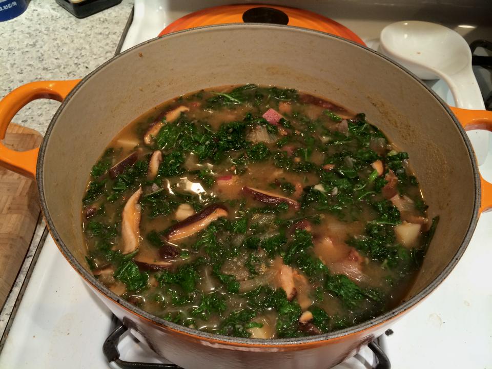 I am not a vegetarian but I don’t usually cook meat when eating at home. Back in grad school I had a CSA and they would put a recipe in with every box (along with some news from the farm). One week it was a recipe for Portuguese kale soup, or caldo verde, and I remember it being delicious. Since the weather has been getting cold here I decided last night to make a batch to keep we warm during the last week of classes. When I went to the store to pick up the chorizo, however, I thought it would be more fun (and easier to share) to make a vegetarian version — that way I could use up my shiitake mushrooms too!